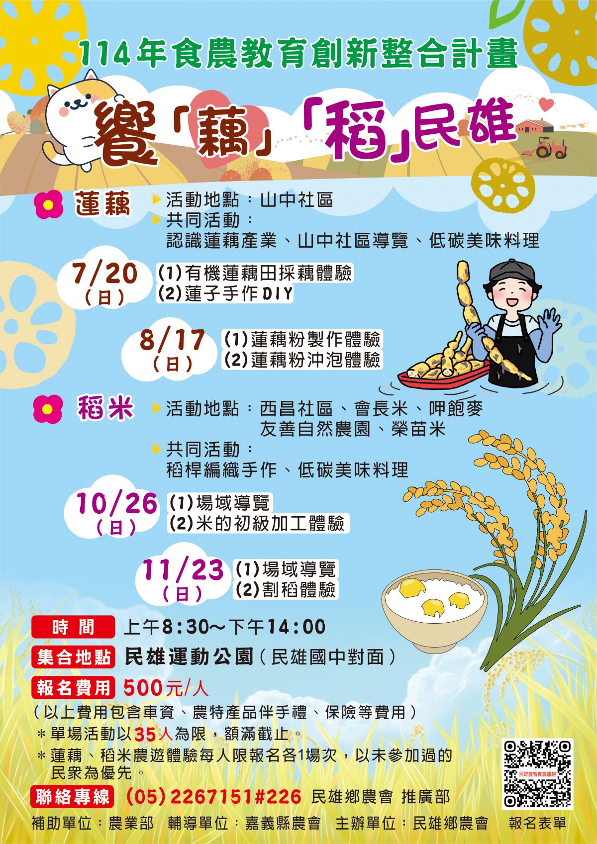 活動日期:7/20、8/17、10/26、11/23 活動內容:認識蓮藕產業、山中社區導覽、低碳美味料理、稻桿編織手作等(詳情請參閱DM) 聯絡專線:05-2267151#226 民雄鄉農會 推廣部 補助單位:農業部 輔導單位:嘉義縣農會 主辦單位:民雄鄉農會