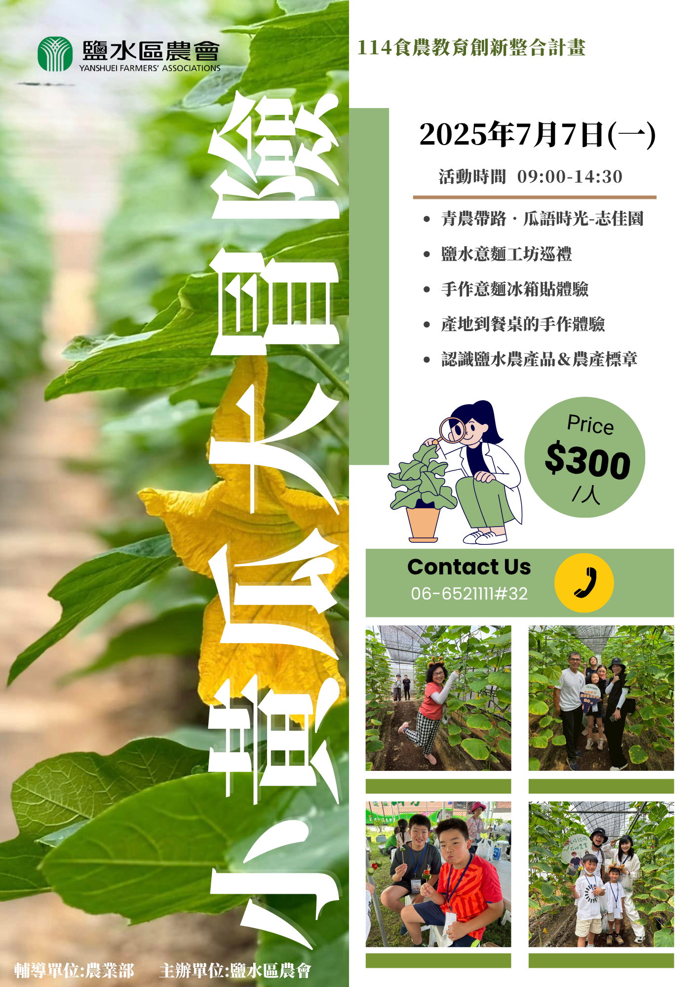 活動日期:7月7日(星期一) 活動內容:青農帶路.瓜語時光、鹽水意麵工坊巡禮、手作意麵冰箱貼體驗、產地到餐桌手作體驗、認識鹽水農產品&農產標章 洽詢專線:06-6521111#32 輔導單位:農業部 主辦單位:鹽水區農會