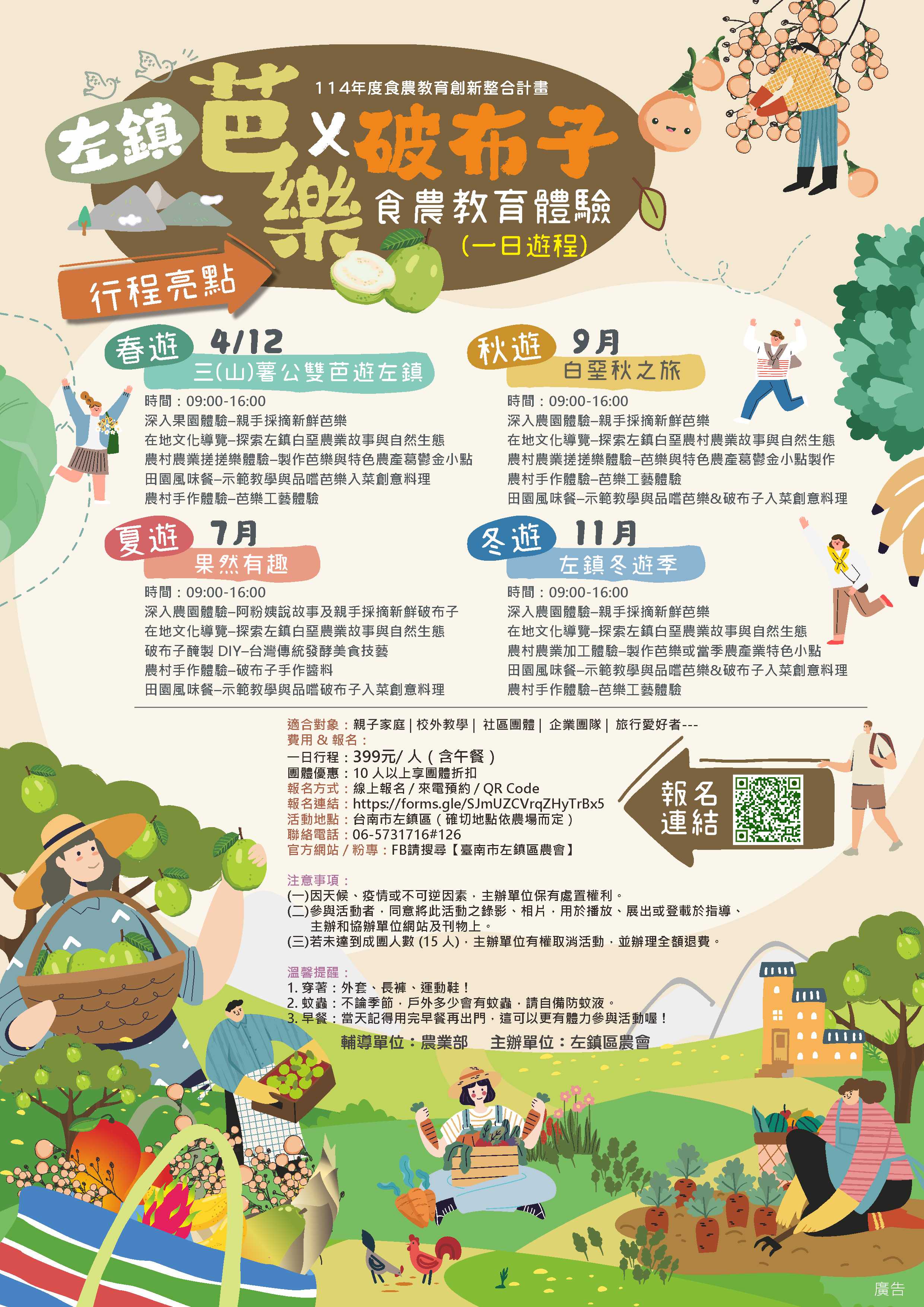 活動日期:7/6 活動內容:深入農園體驗、在地文化導覽、破布子醃製DIY、農村手作體驗 洽詢電話:06-5731716#125、126 輔導單位:農業部 主辦單位:左鎮區農會