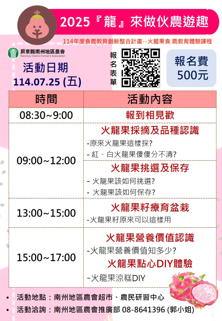 活動日期:7/25 活動內容:火龍果採摘及品種認識、火龍果挑選及保存、火龍果籽療育盆栽、火龍果營養價值認識、火龍果點心DIY體驗 洽詢專線:南州地區農會推廣部08-8641396 郭小姐