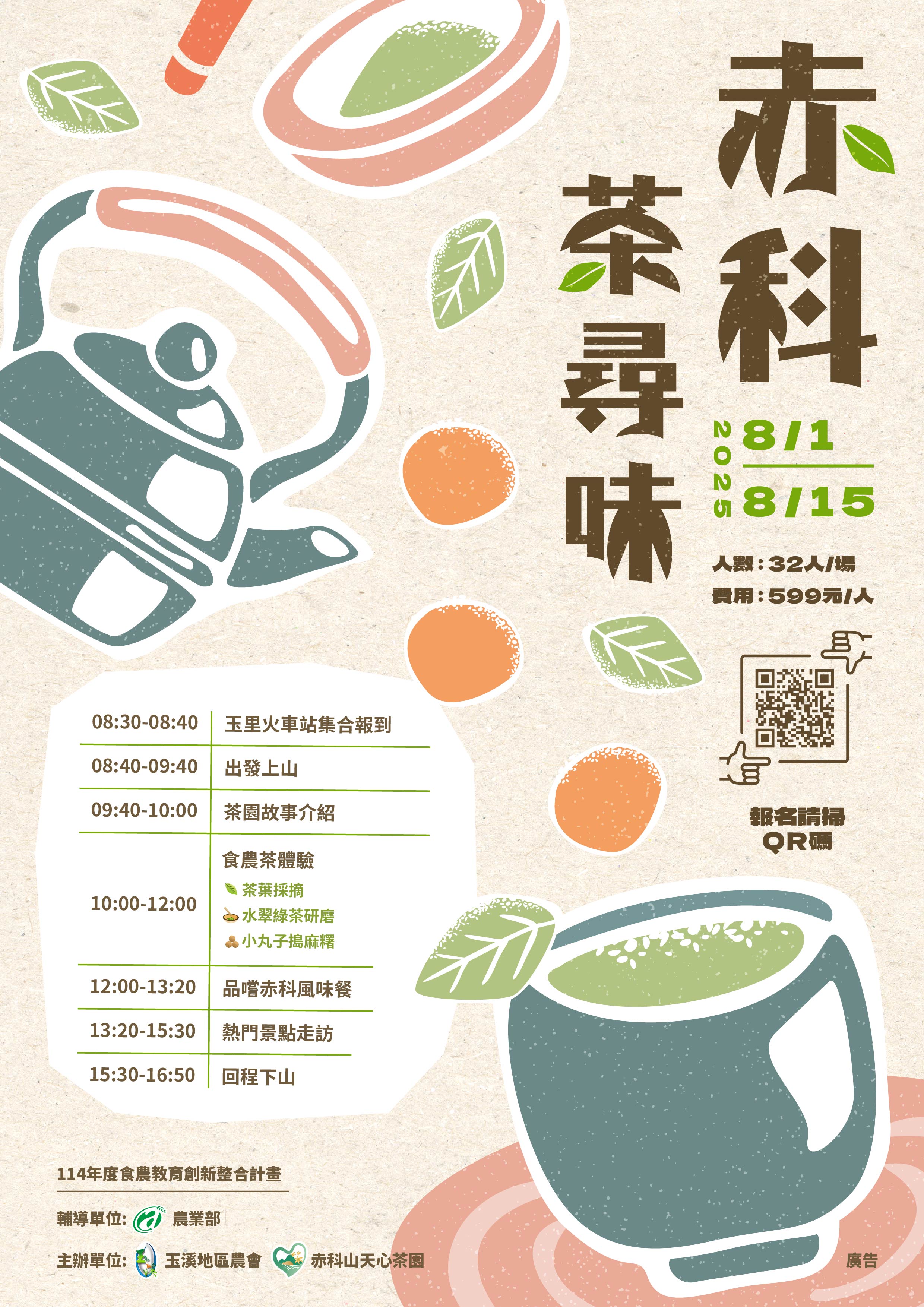 活動時間:8/1、8/15 活動內容:茶園故事介紹、食農茶體驗、品嚐赤科風味餐、熱門景點走訪 輔導單位:農業部 主辦單位:玉溪地區農會、赤科山天心茶園