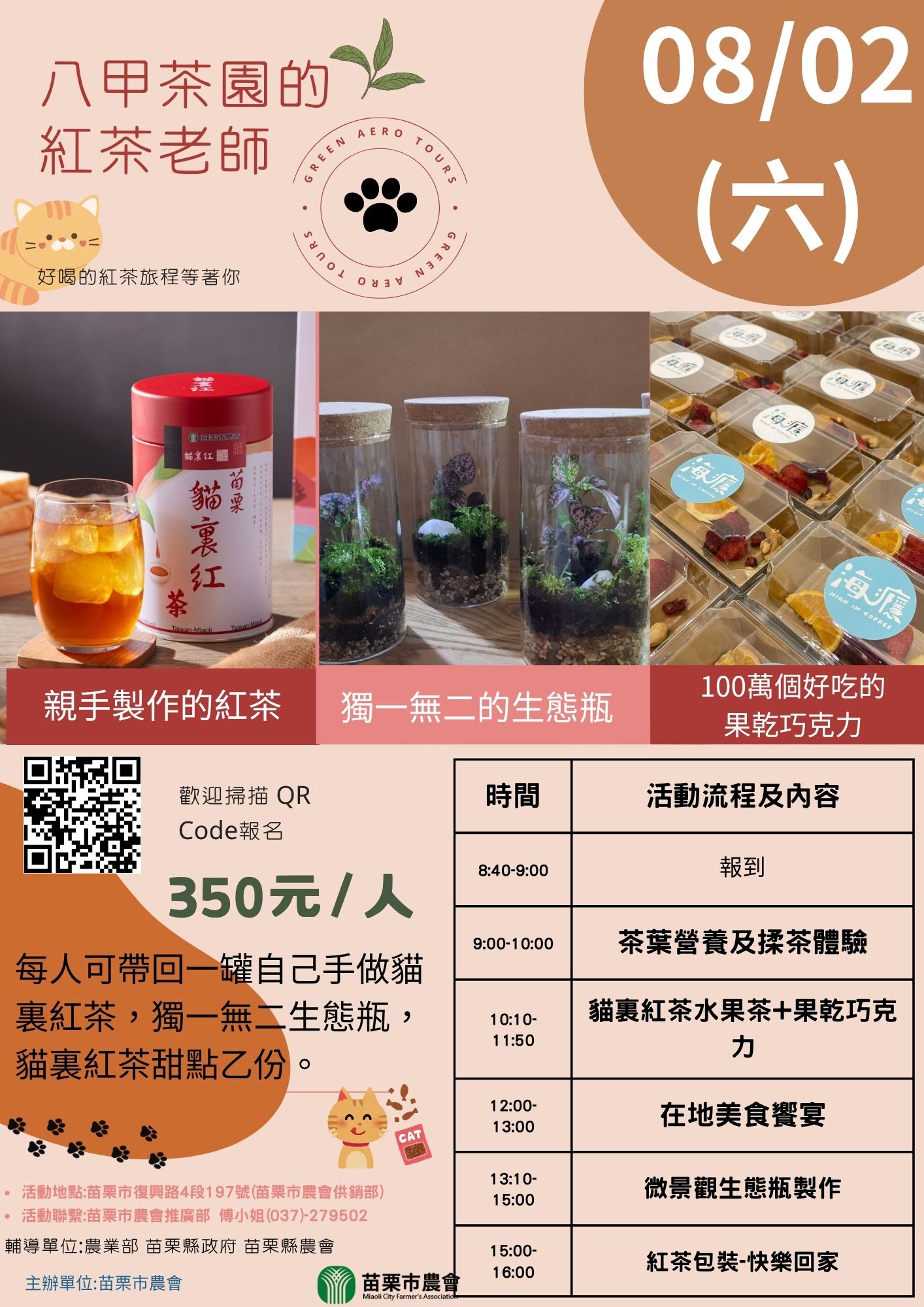 活動日期:8/2 活動內容:茶葉營養及楺茶體驗、貓裏紅茶水果茶、果乾巧克力、微景觀生態瓶製作、紅茶包裝 輔導單位:農業部、苗栗縣政府、苗栗縣農會 主辦單位:苗栗市農會