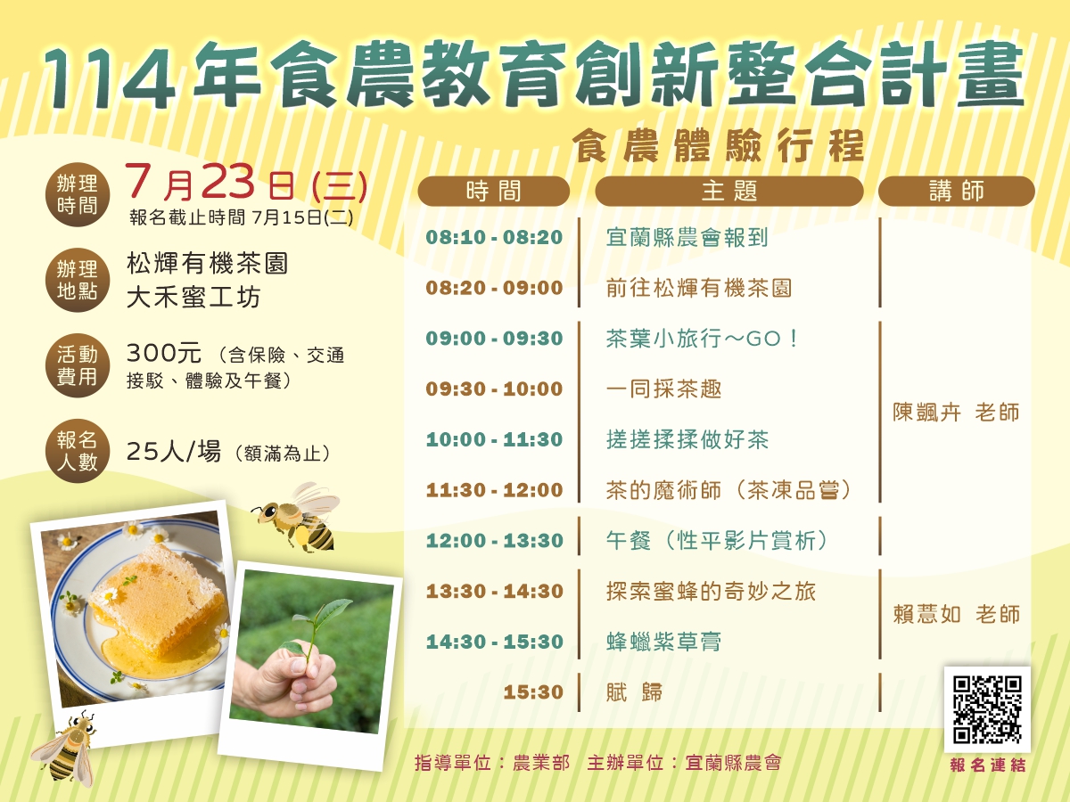 活動日期:7/23 活動內容:一同採茶趣、搓搓楺楺做好茶、茶的魔術師、探索蜜蜂的奇妙之旅、蜂蠟紫草膏 指導單位:農業部 主辦單位:宜蘭縣農會