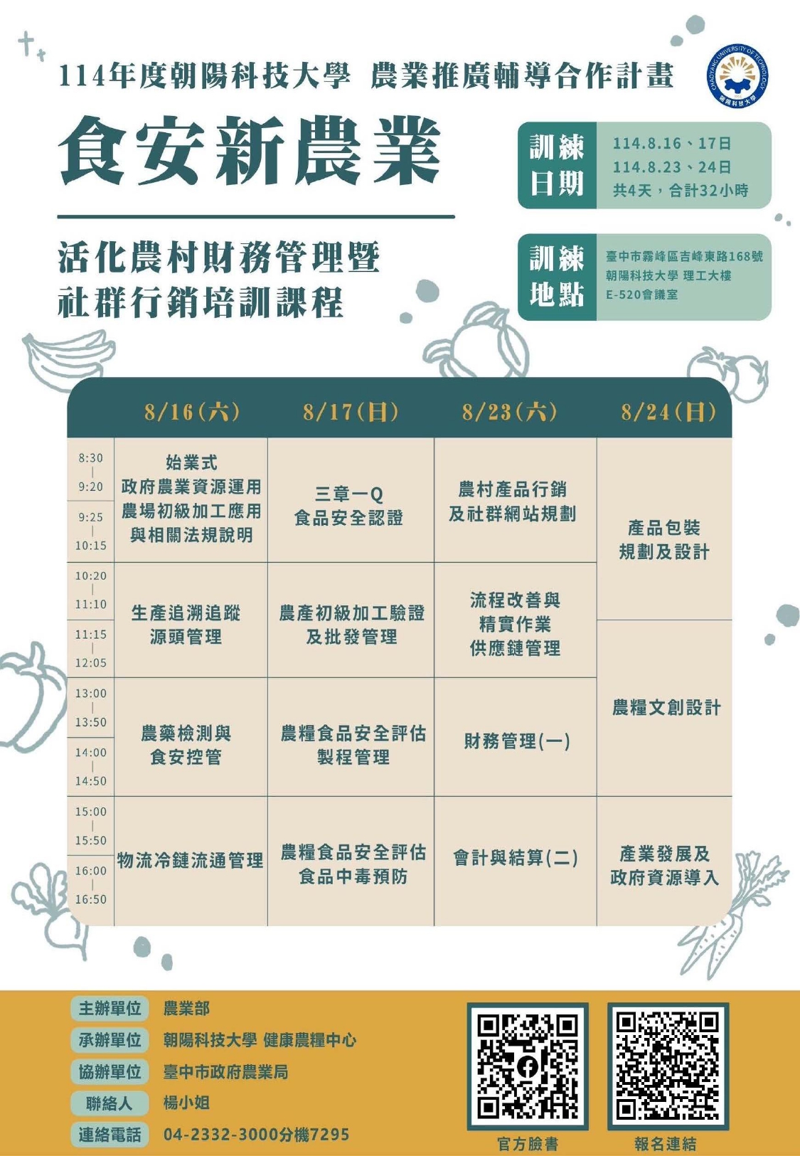 一、課程日期:114年8月16日、8月17日、8月23日、8月24日,共計4天,可分開報名。 二、地點:朝陽科技大學理工大樓E-520會議室。