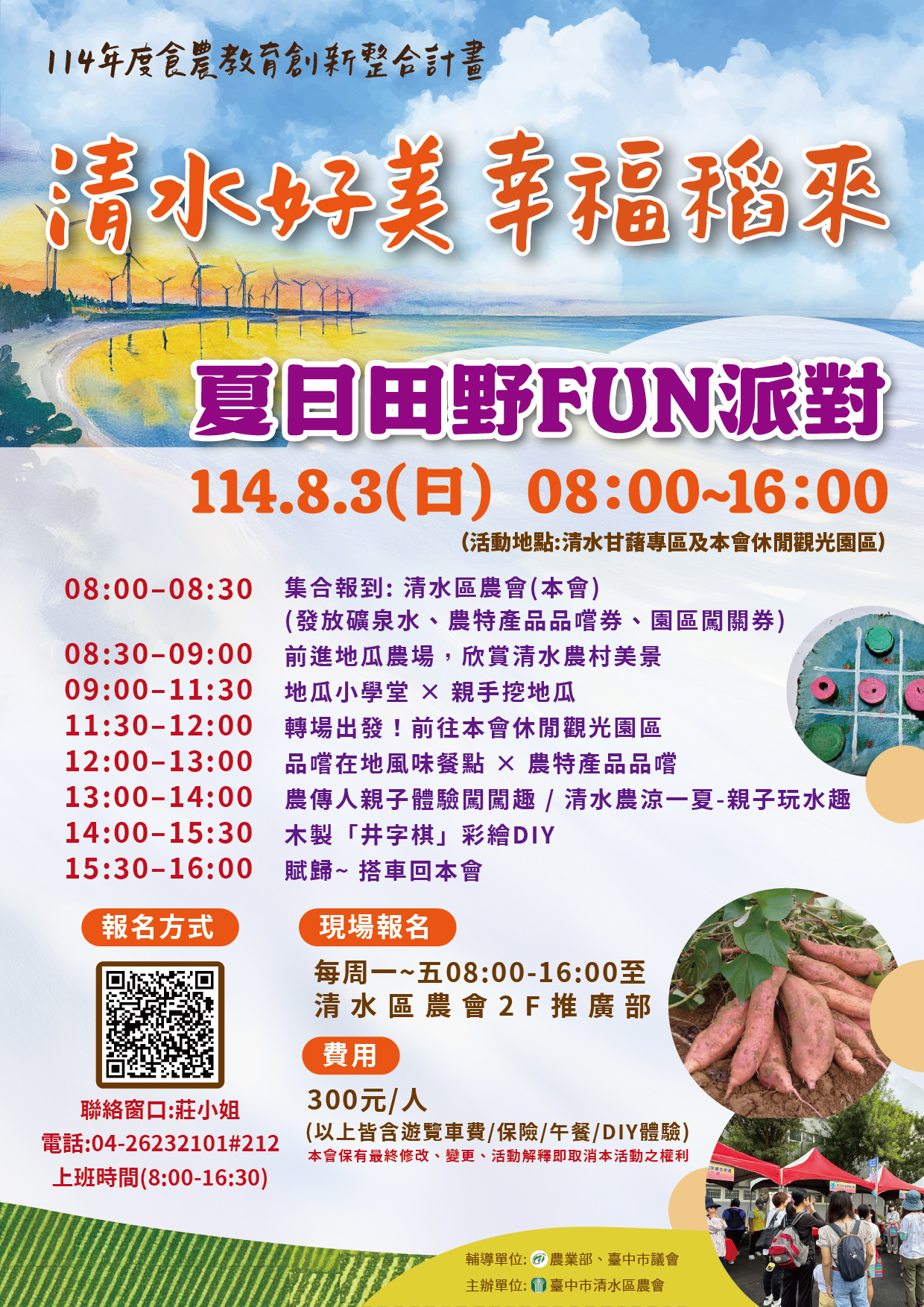 活動日期:8/3(日) 活動內容:前進地瓜農場、地瓜小學堂、清水休閒觀光園區、親子體驗闖關趣、木製井字棋彩繪DIY 洽詢電話:04-26232101#212 莊小姐 輔導單位:農業部、臺中市議會 主辦單位:臺中市清水區農會