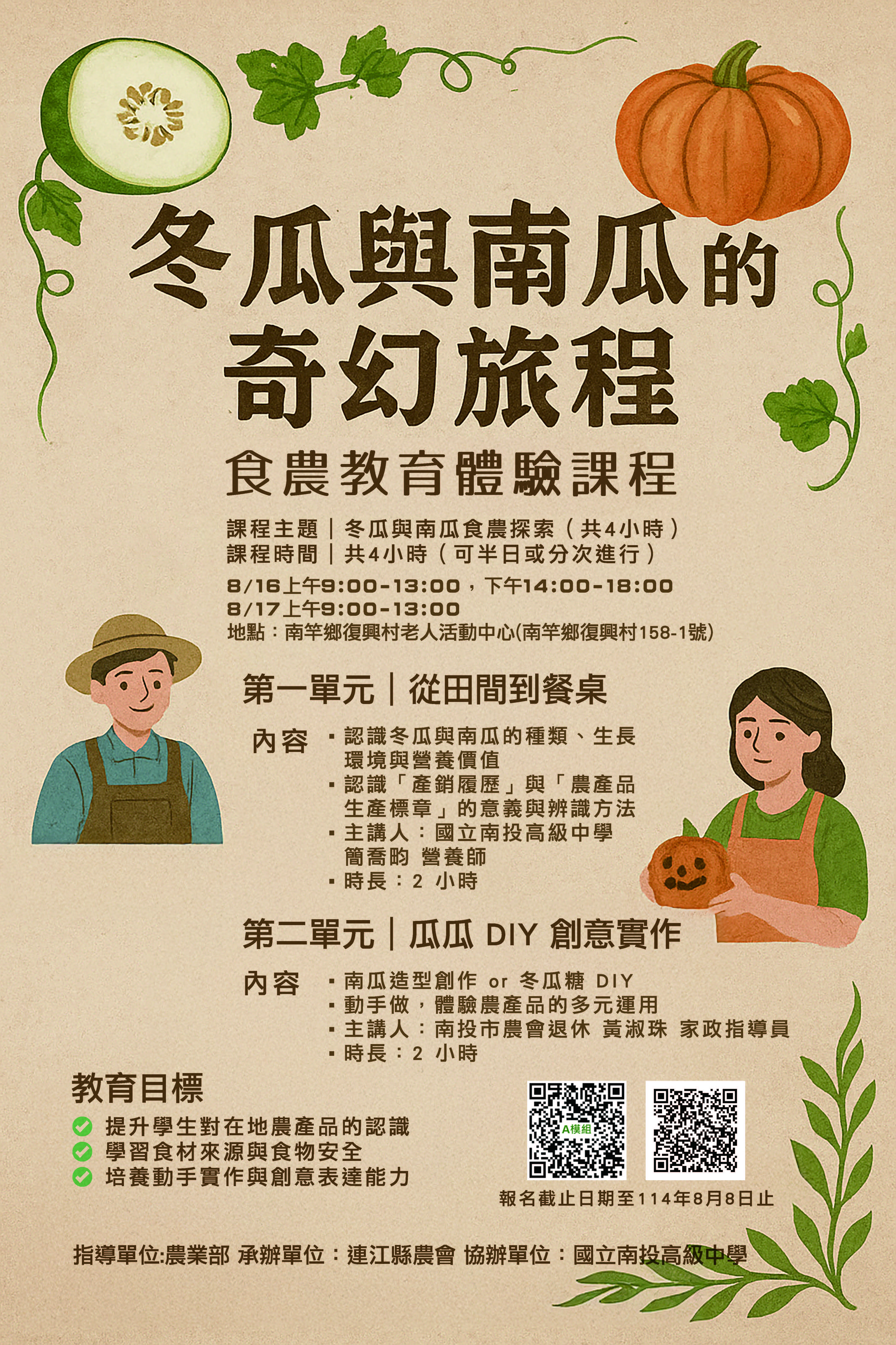 活動日期:8月16日(六)、8月17日(日) 活動內容:從田間到餐桌、瓜瓜DIY創意實作 活動報名:請掃活動DM QR碼填寫報名資料 指導單位:農業部 承辦單位:連江縣農會 協辦單位:國立南投高級中學