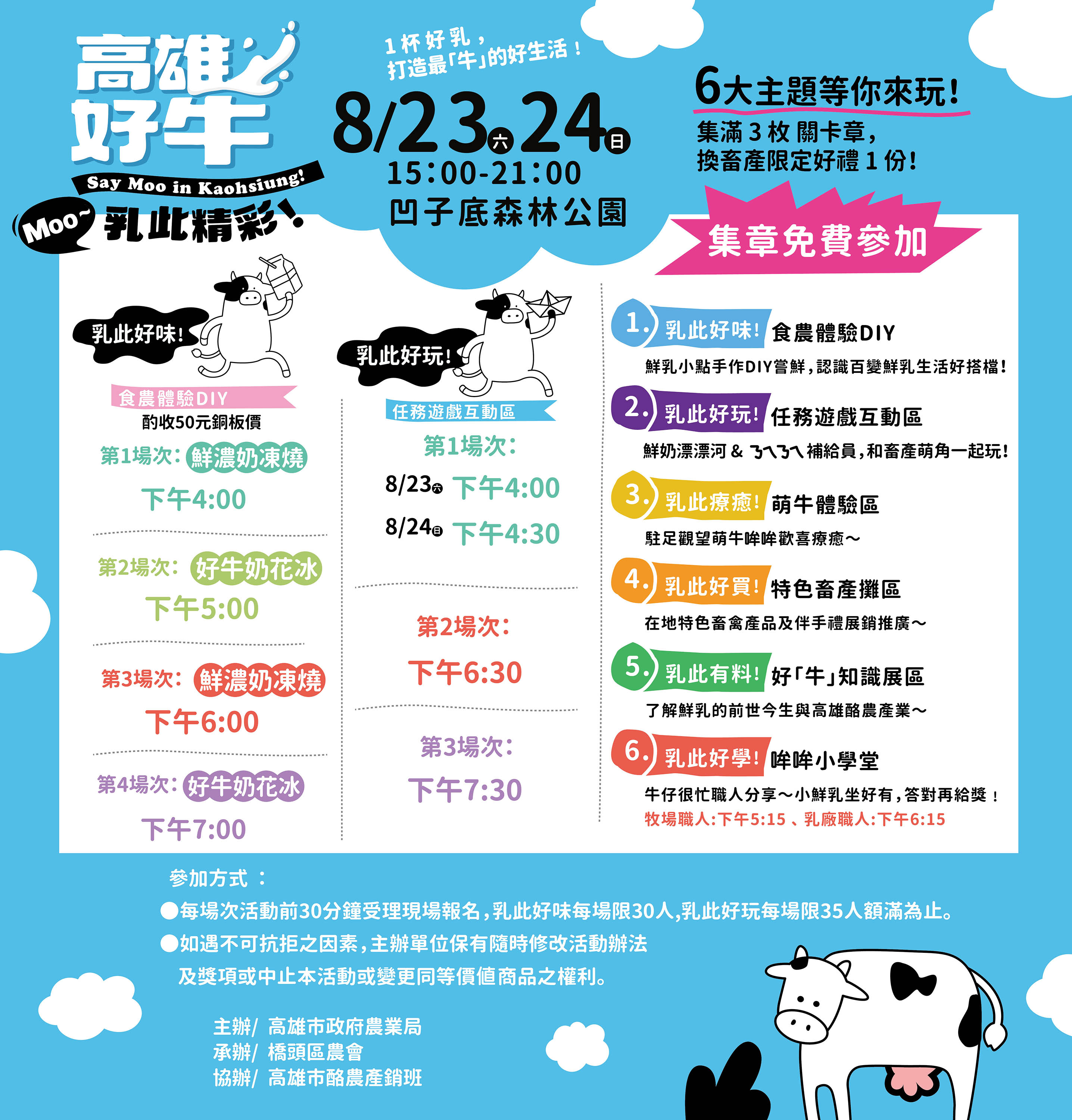活動日期:8月23、24日(星期六、日) 活動內容:乳此好味、乳此好玩、乳此療癒、乳此好買、乳此有料、乳此好學 活動地點:凹子底森林公園 主辦單位:高雄市政府農業局 承辦單位:橋頭區農會 協辦單位:高雄市酪農產銷班