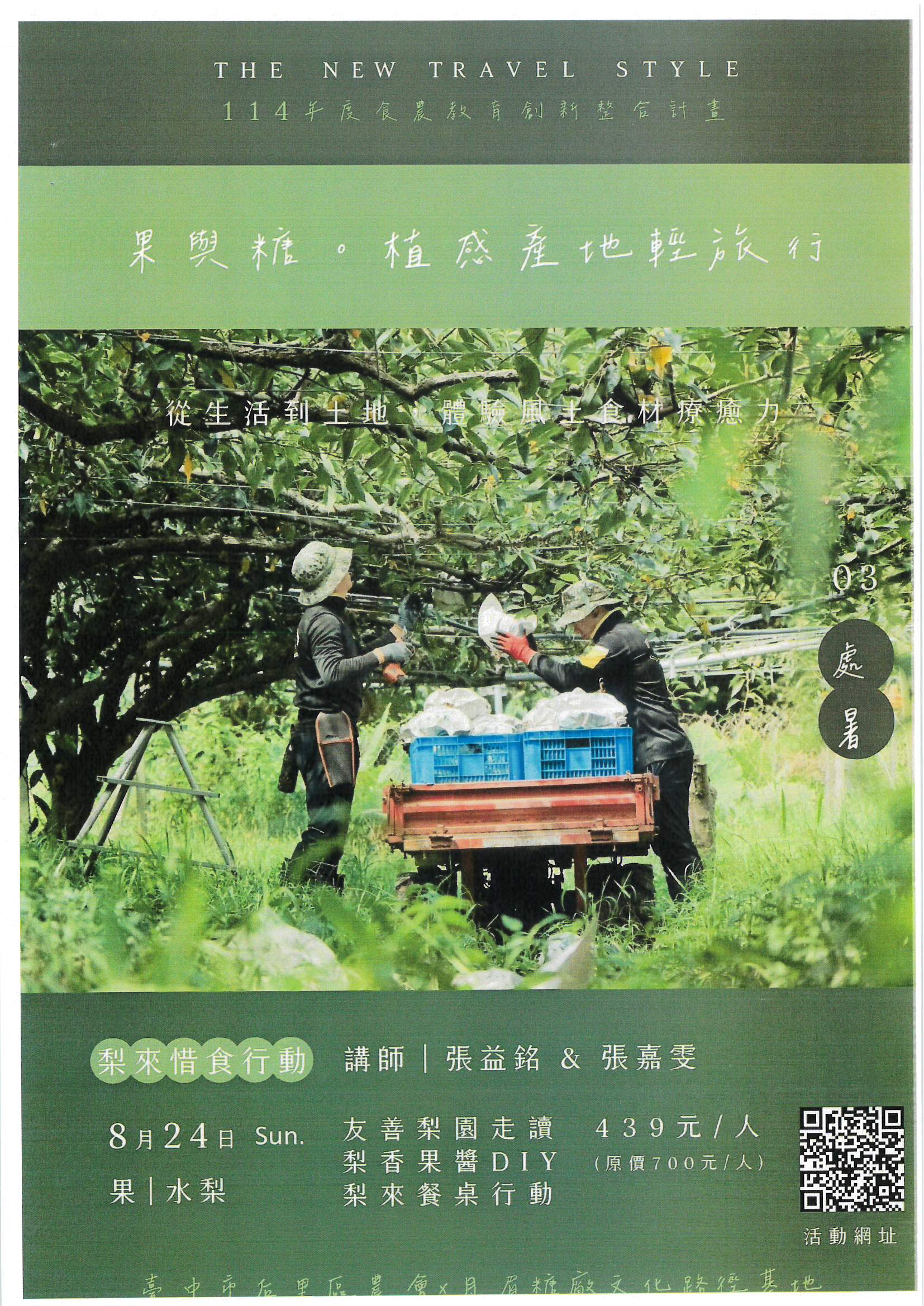 活動日期:8月24日 活動內容:友善梨園走讀、梨香果醬DIY、梨來餐桌行動 洽詢專線:何小姐 0965-010690/周小姐 0928-342293 指導單位:農業部 主辦單位:臺中市后里區農會 合作單位:月眉糖廠文化路徑基地、臺中市青年農民聯誼會后里分會