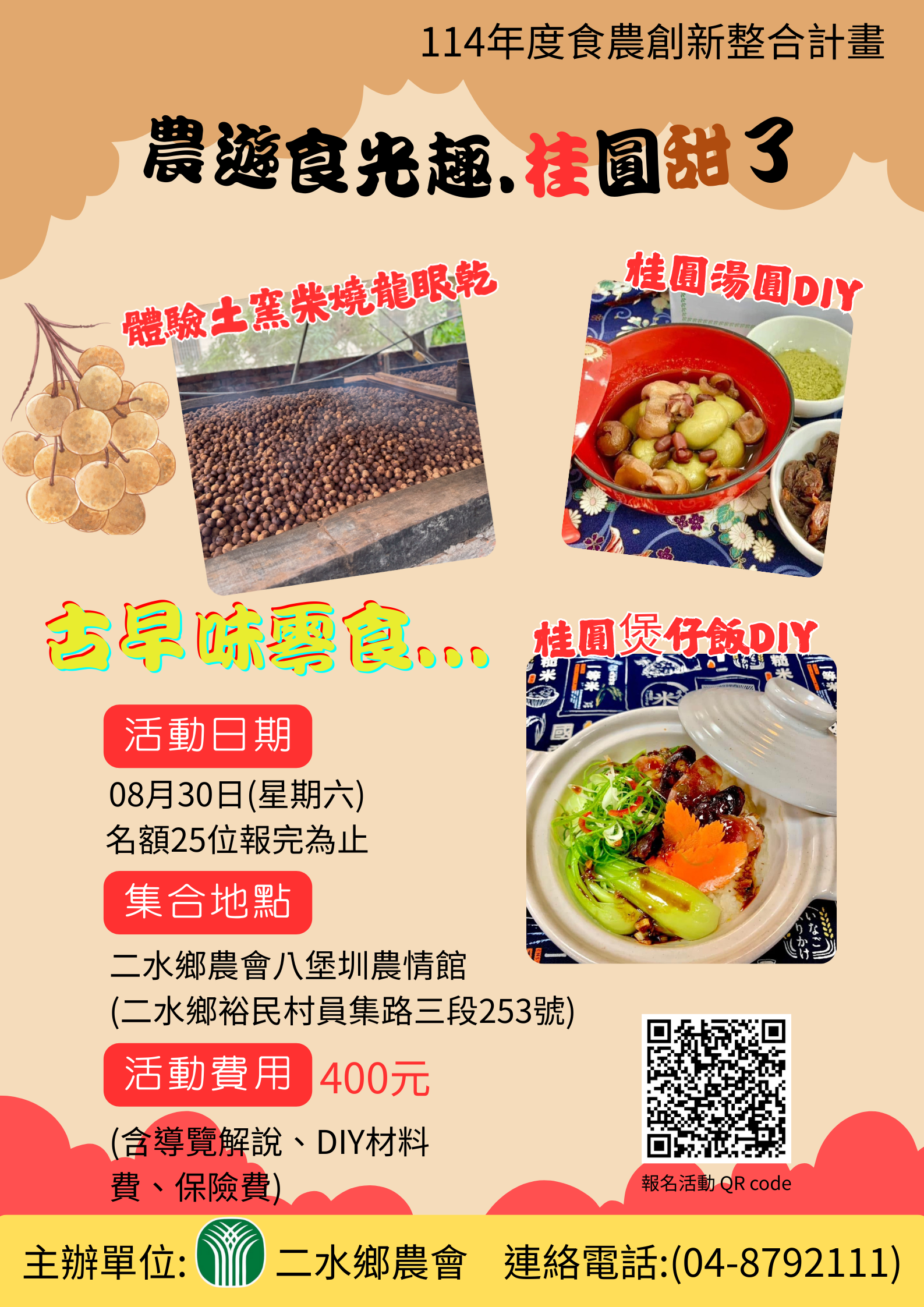 活動日期:8月30日(六) 活動內容:體驗土窯柴燒龍眼、桂園湯圓DIY、桂圓煲仔飯DIY 連絡電話:04-8792111 主辦單位:二水鄉農會