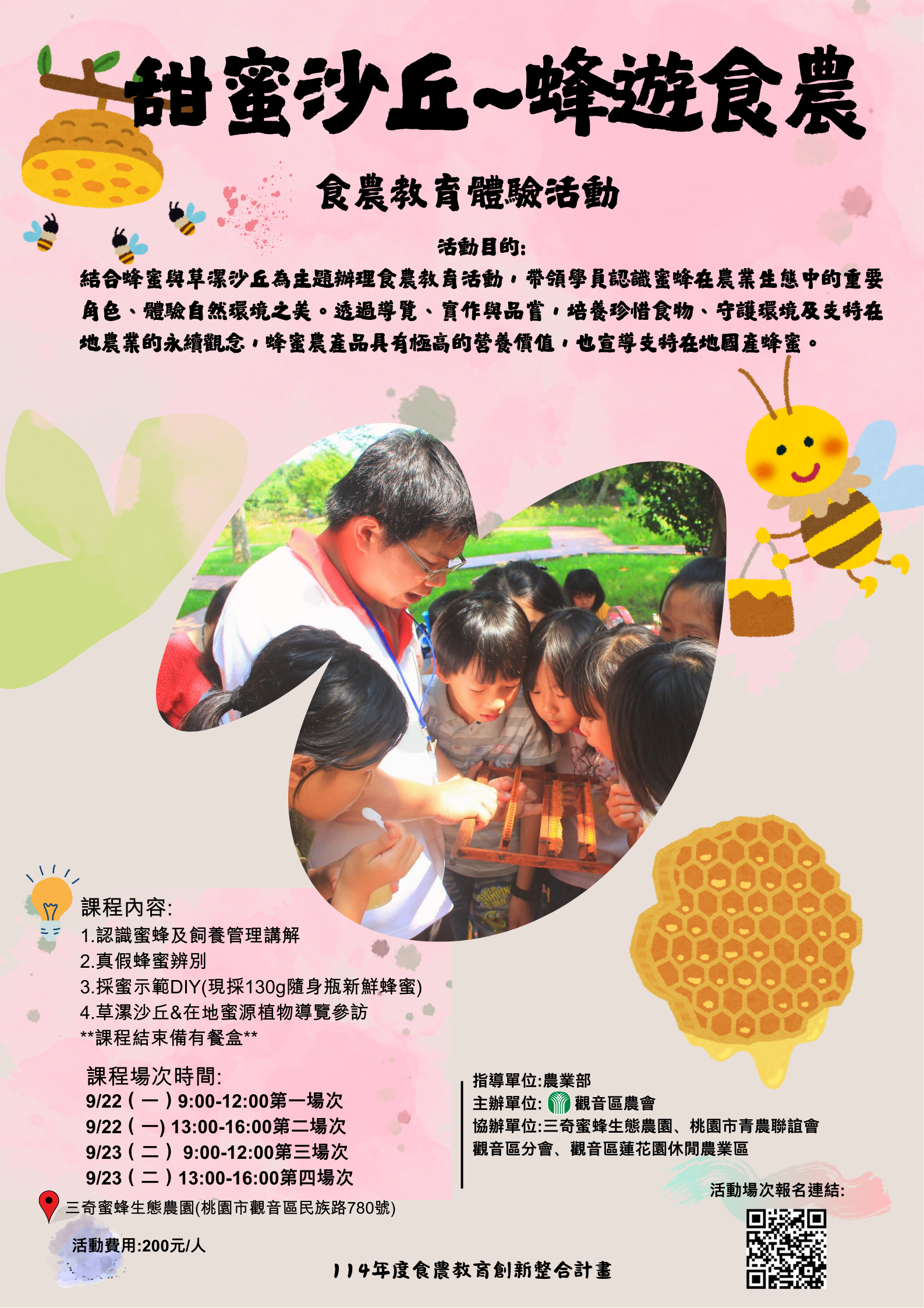 活動日期:9/22、9/23 活動內容:認識蜜蜂及飼養管理講解、真假蜂蜜辨、採蜜示範DIY、在地蜜源植物導覽參訪 指導單位:農業部 主辦單位:觀音區農會 協辦單位:三奇蜜蜂生態農園、桃園市青農聯誼會觀音區分會、觀音區蓮花園休閒農業區