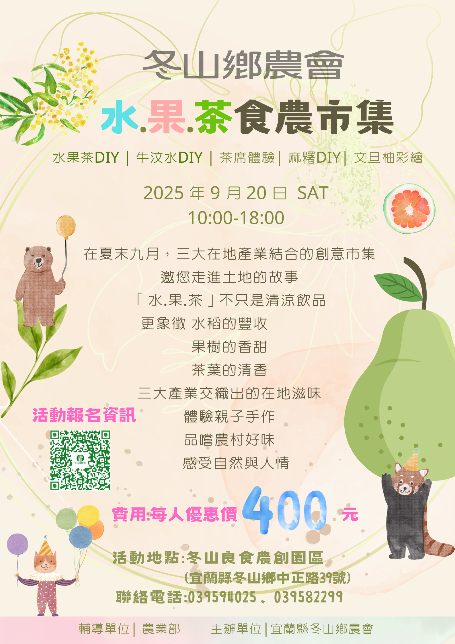 活動日期:9月20日(六) 活動內容:水果茶DIY、牛汶水DIY、茶席體驗、麻糬DIY、文旦柚彩繪 聯絡電話:03-9594025、03-9582299 輔導單位:農業部 主辦單位:宜蘭縣冬山鄉農會