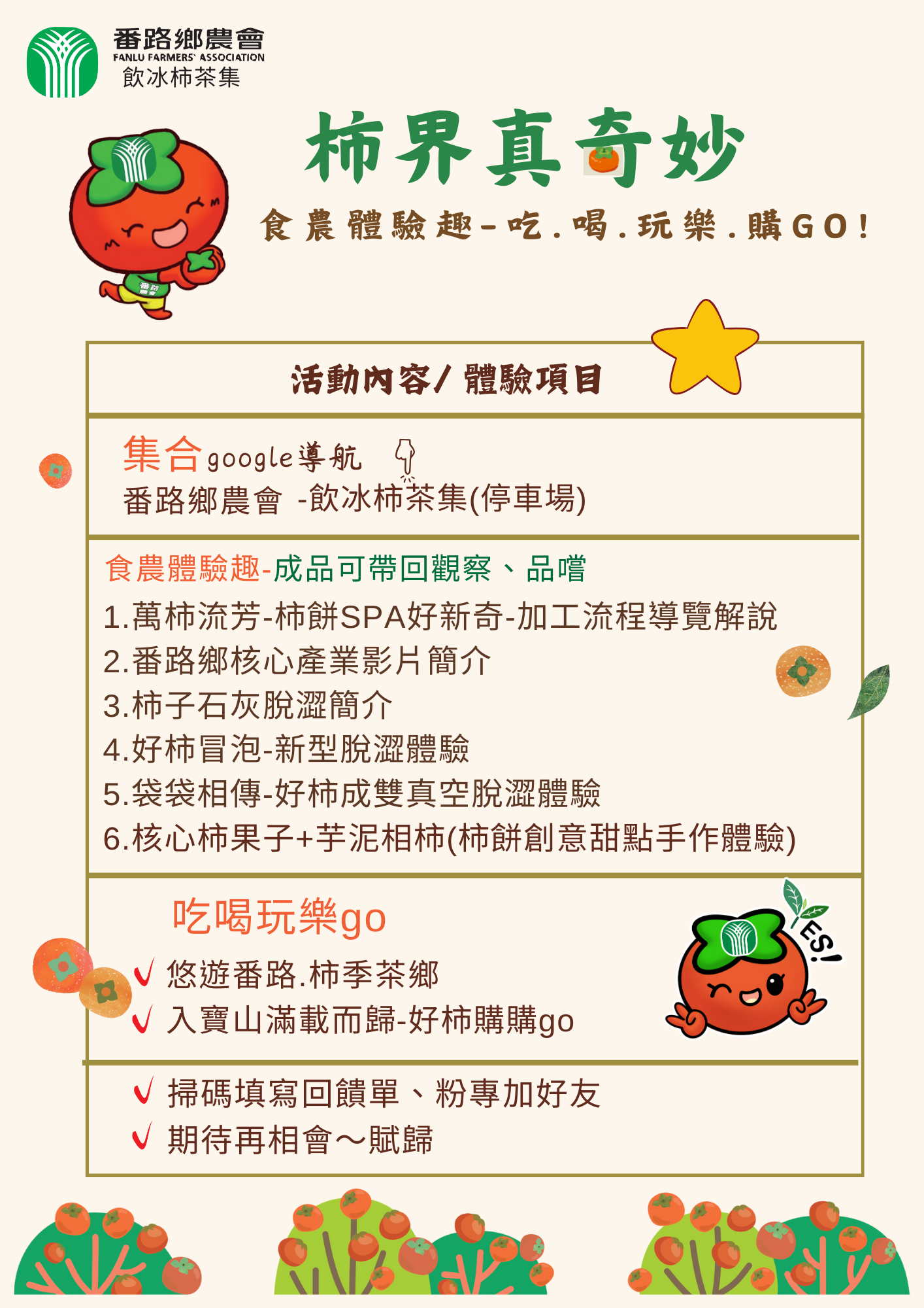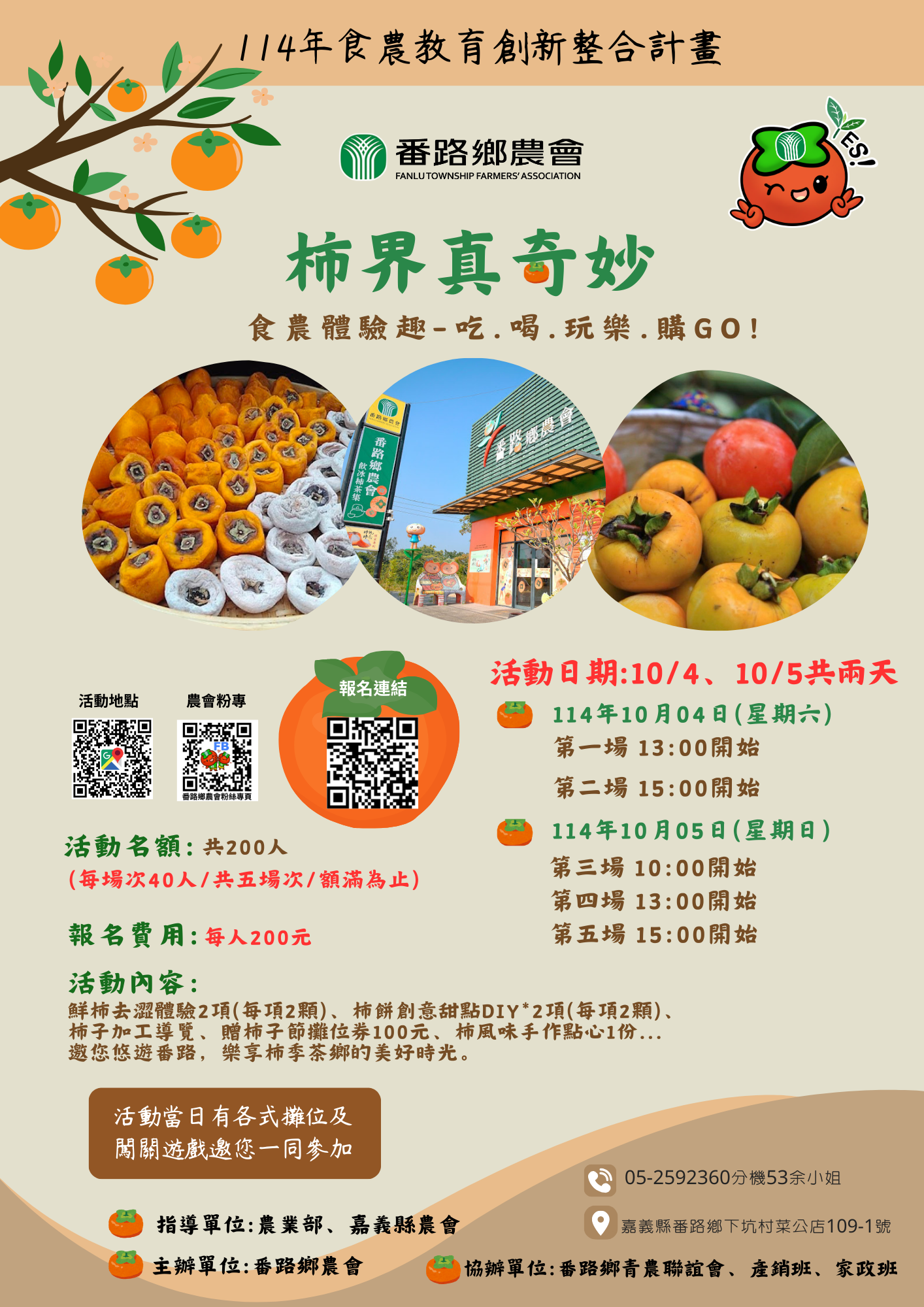 活動日期:10月4日、10月5日 活動內容:鮮柿去澀體驗、柿餅創意甜點、柿子加工導覽 聯絡專線:05-2592360分機53 余小姐 指導單位:農業部、嘉義縣農會 主辦單位:番路鄉農會 協辦單位:番路鄉青農聯誼會、產銷班、家政班