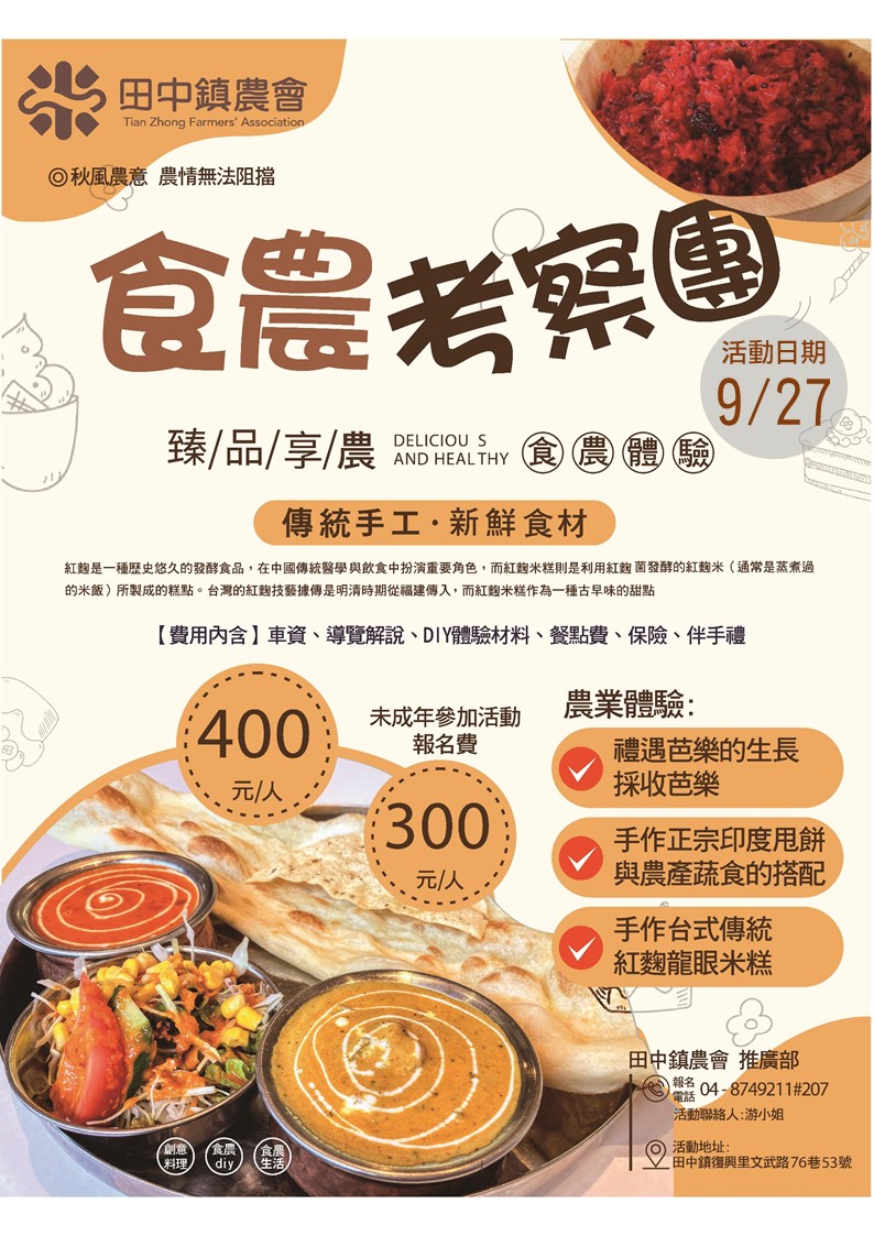 活動日期:9月27日 活動內容:禮遇芭樂的生長、手作正宗印度甩餅、手作台式傳統紅麴龍眼米糕 聯絡電話:04-8749211#207 游小姐