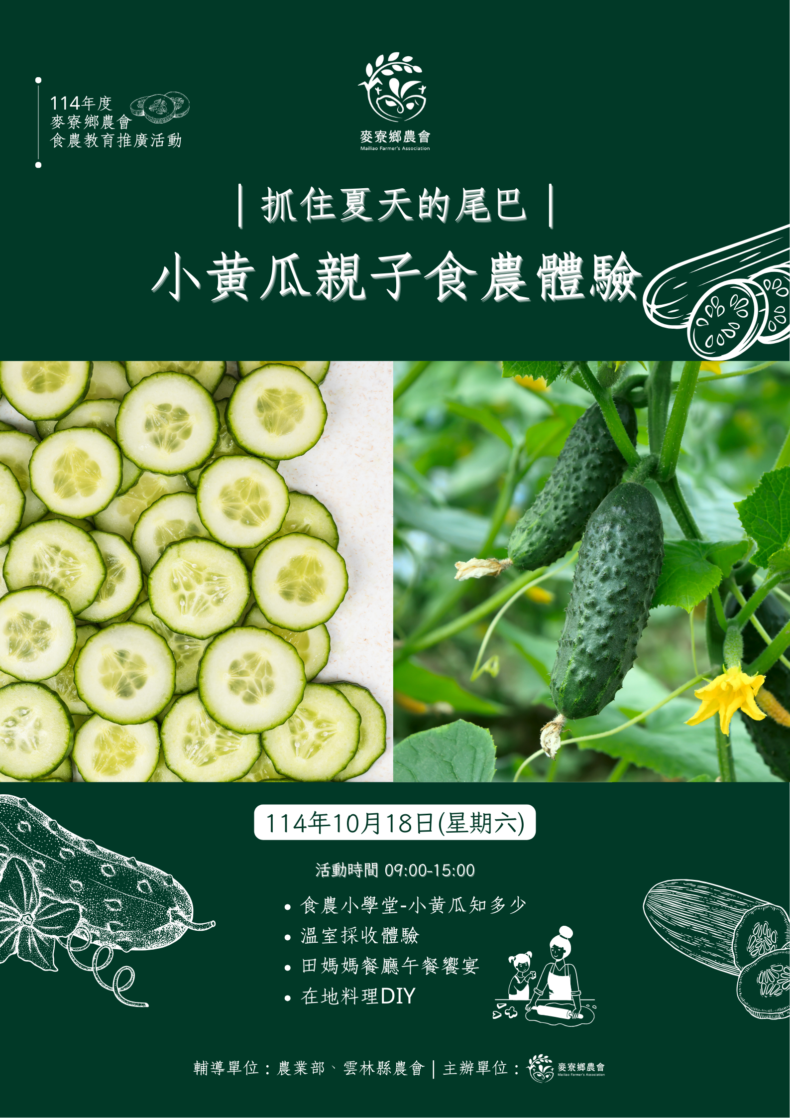 活動日期:10月18日 活動內容:食農小學堂、溫室採收體驗、在地料理DIY 報名專線:05-6931101#123 周小姐 輔導單位:農業部、雲林縣農會 主辦單位:麥寮鄉農會