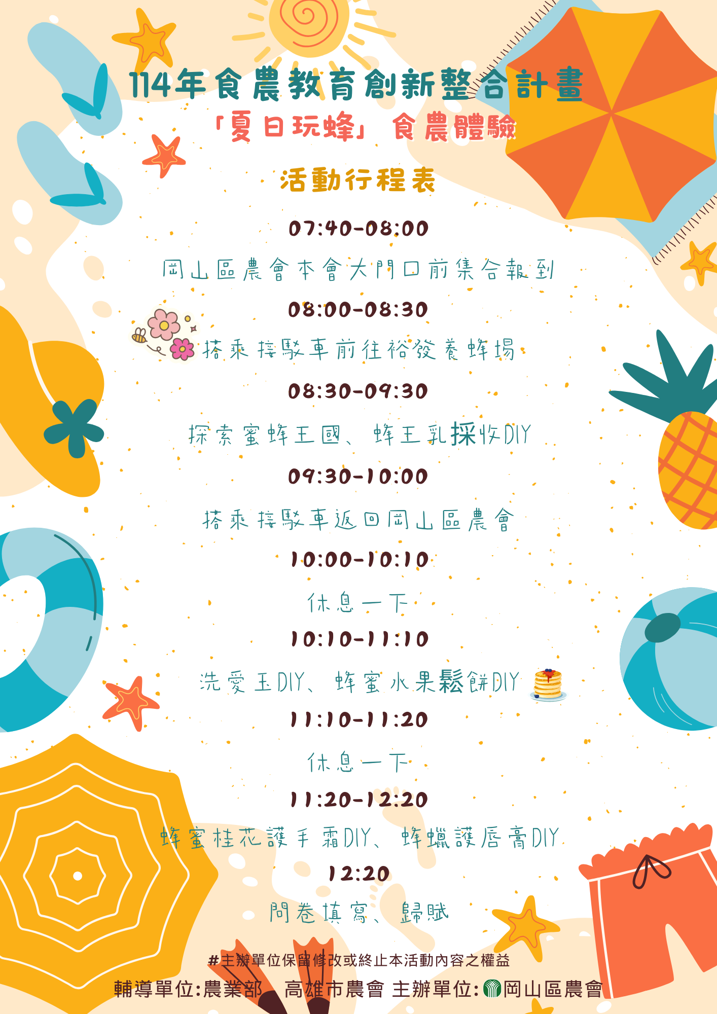 活動日期:10/19、10/25、10/26 活動內容:探索蜜蜂王國、蜂王乳採收DIY、洗愛玉DIY、蜂蜜水果鬆餅DIY、蜂蜜桂花護手霜DIY、蜂蠟護唇膏DIY(DIY活動依場次調整) 聯絡專線:07-6221241#244 推廣部 林小姐 輔導單位:農業部、高雄市農會 主辦單位:岡山區農會
