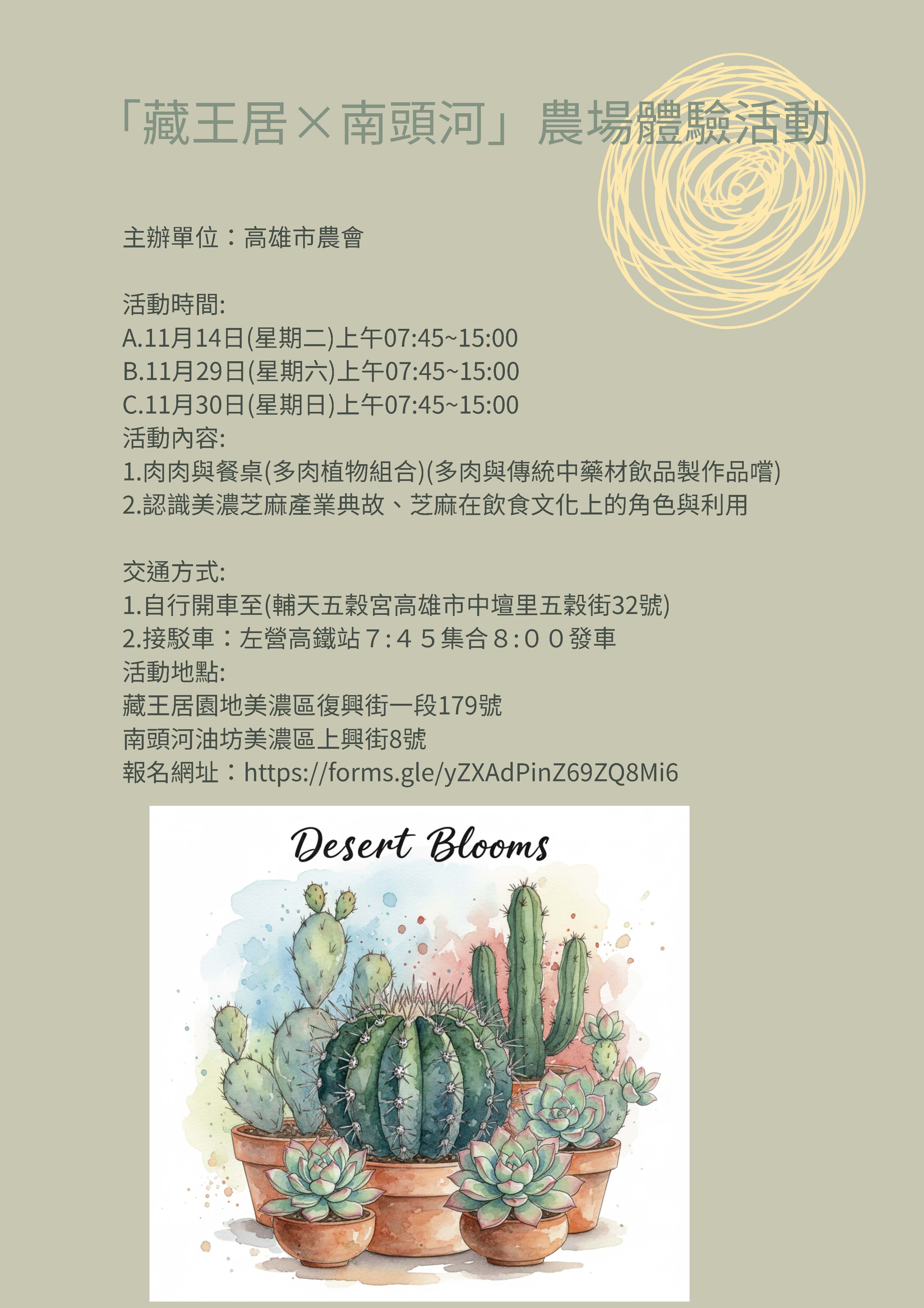 活動日期:11月14日、11月29日、11月30日 活動內容:肉肉與餐桌、認識美濃芝麻產業 主辦單位:高雄市農會
