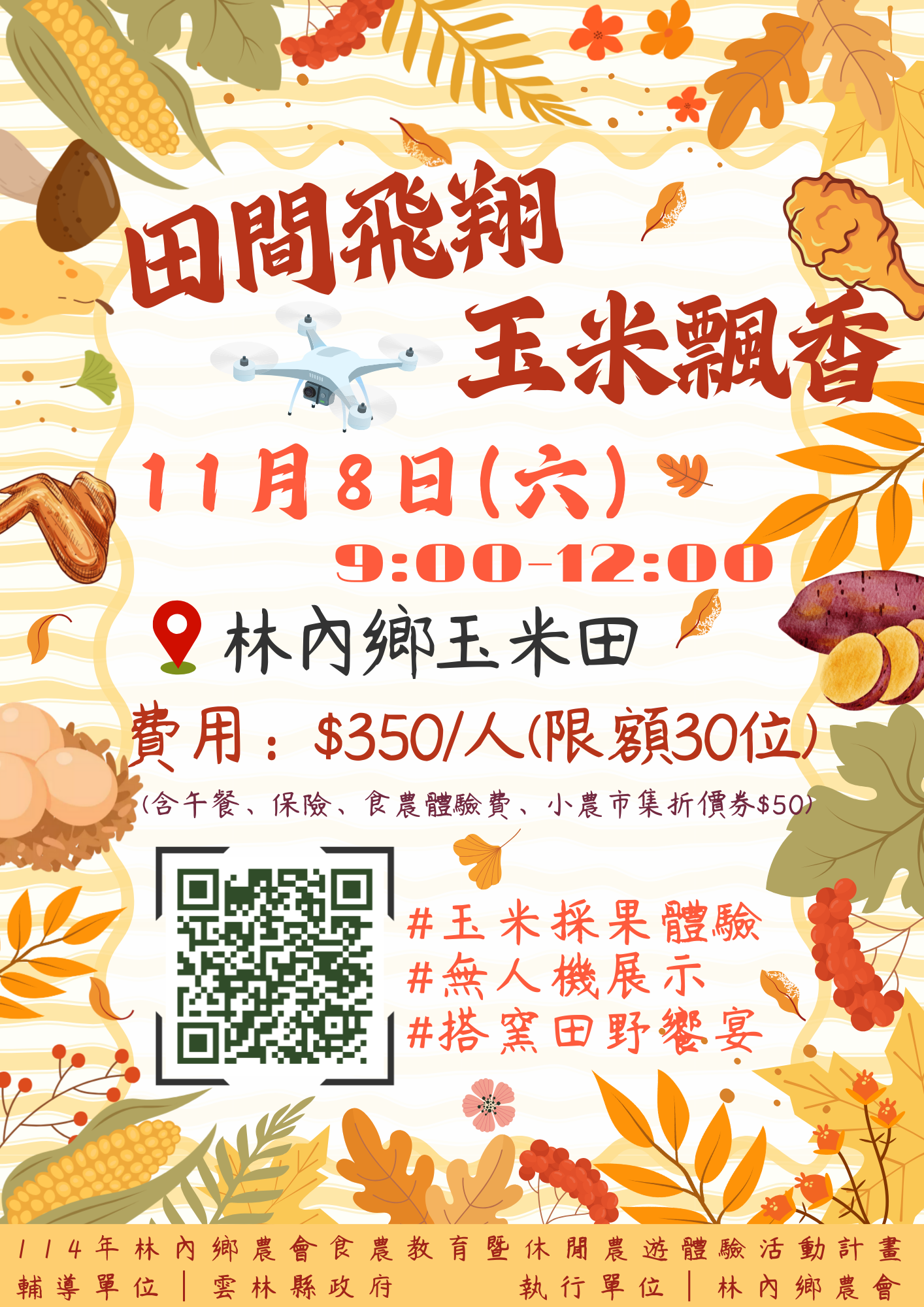 活動日期:11月8日 活動內容:玉米採果體驗、無人機展示、搭窯田野饗宴 聯絡專線:林內鄉農會推廣部05-5892002分機30、31、34 輔導單位:雲林縣政府 執行單位:林內鄉農會
