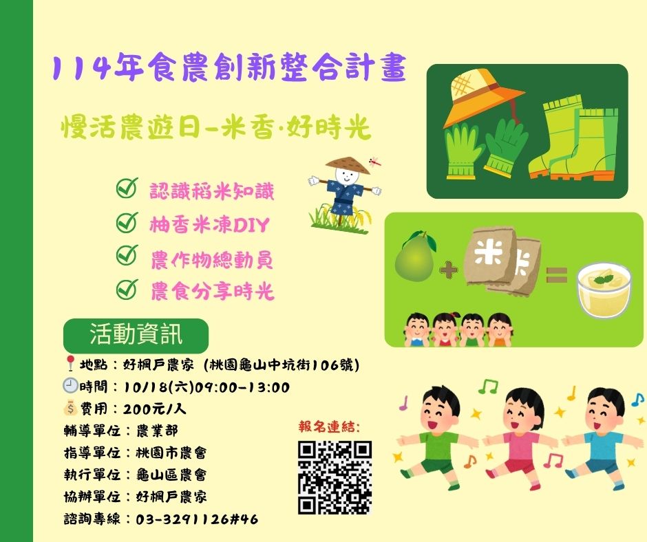 活動日期:10月18日 活動內容:認識稻米知識、柚香米凍DIY、農作物總動員、農食分享時光 諮詢專線:03-3291126#46 輔導單位:農業部 指導單位:桃園市農會 執行單位:龜山區農會 協辦單位:好楓戶農家
