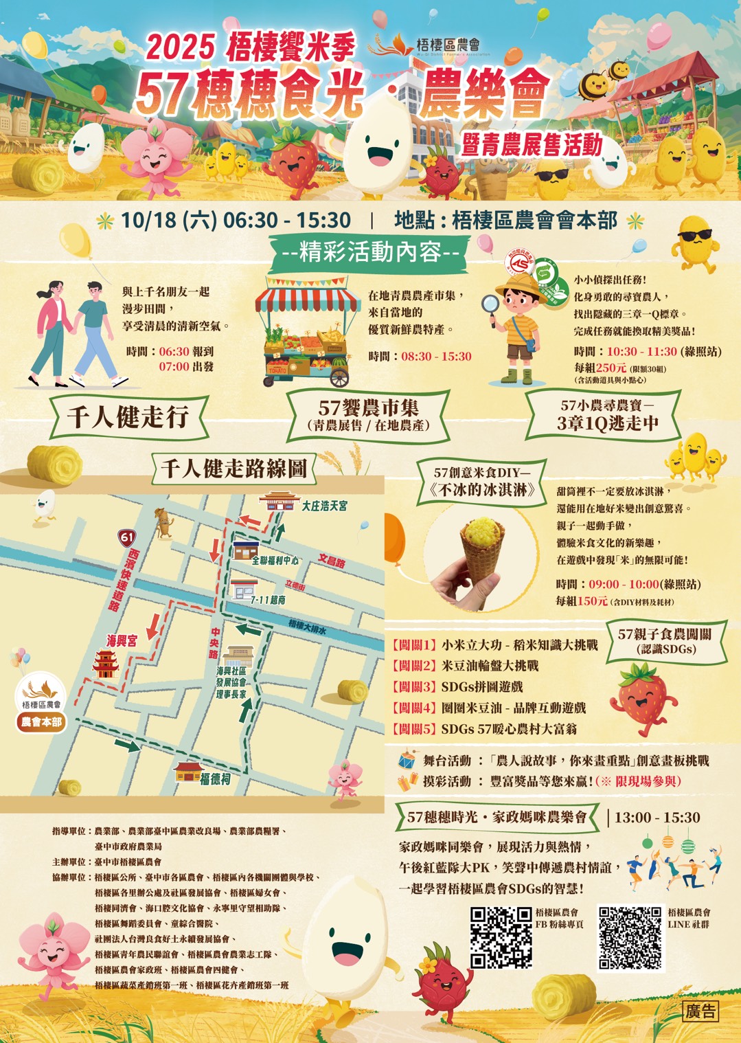 活動日期:10月18日 活動內容:千人健走行、57饗農市集、57創意米食DIY、57小農尋寶 指導單位:農業部、農業部臺中區農業改良場、農業部農糧署、臺中市政府農業局 主辦單位:臺中市梧棲區農會