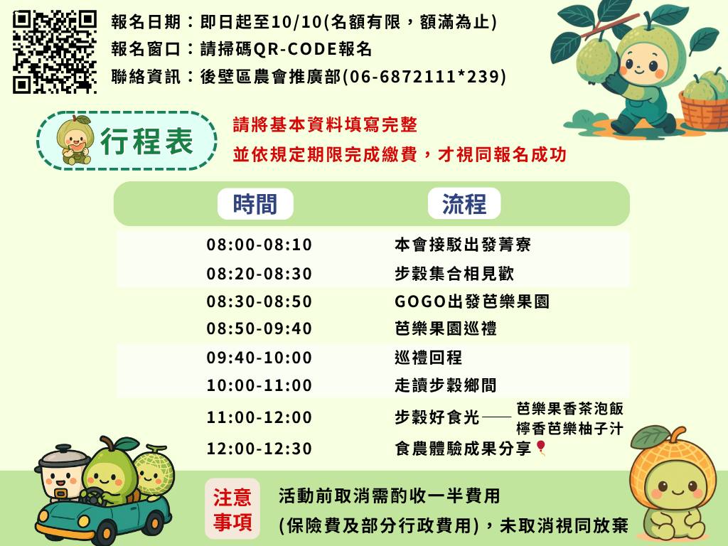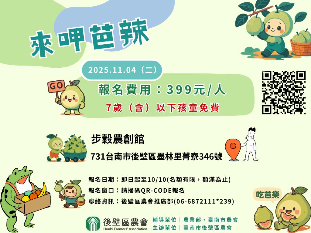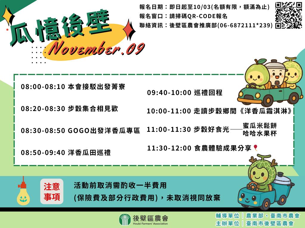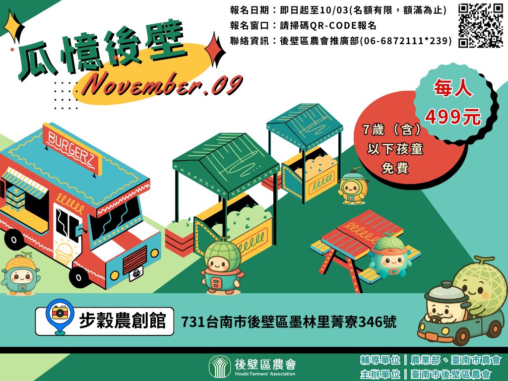 活動日期:11月4日、11月9日 活動內容:洋香瓜田巡禮、走讀步穀鄉間、步穀好食光、芭樂果園巡禮 聯絡資訊:後壁區農業 推廣部 06-6872111#239 輔導單位:農業部、臺南市農會 主辦單位:臺南市後壁區農會