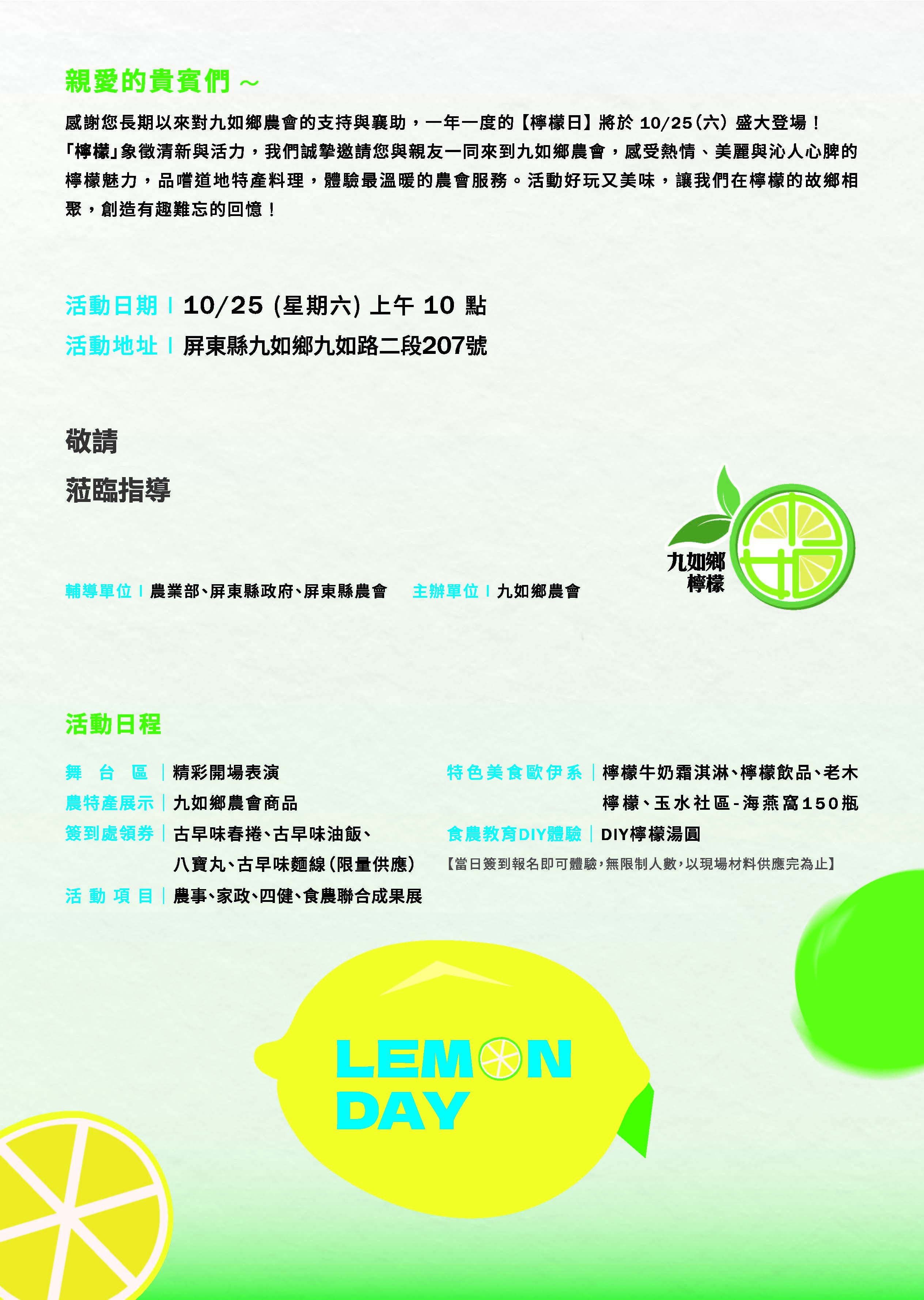 活動日期:10月25日 活動內容:農特產展示、聯合成果展、特色美食、食農教育體驗 輔導單位:農業部、屏東縣政府、屏東縣農會 主辦單位:九如鄉農會