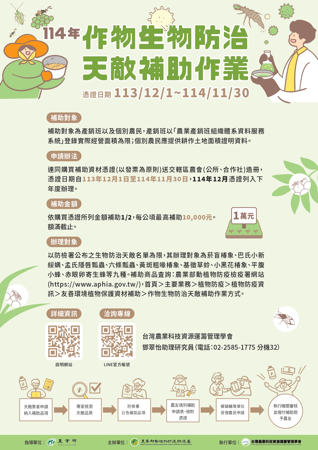 農業部動植物防疫檢疫署「114年度作物生物防治天敵補助作業」相關資訊