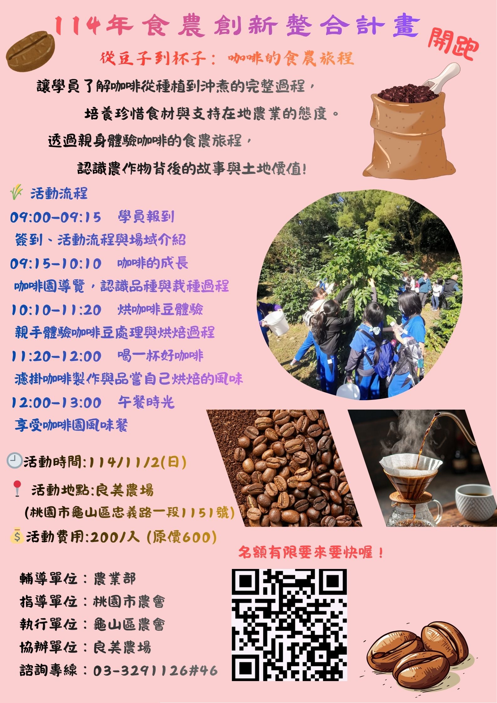 活動日期:11月2日 活動內容:咖啡的成長、烘咖啡豆體、喝一杯好咖啡 諮詢專線:03-3291126#46 輔導單位:農業部 指導單位:桃園市農會 執行單位:龜山區農會 協辦單位:良美農場