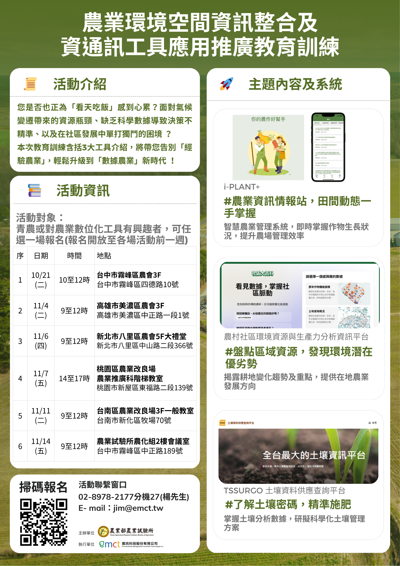 一、目的:針對農業部農業試驗所開發的「i-PLANTAPP」、「農村社區環境與生產力分析資訊平台」及「土壤資料供應查詢平台」等資通訊工具,協助農友能夠快速取得農業生產環境之土壤特性、氣候條件及肥培管理資訊,有助於達到精準及永續農業管理之目標。 二、報名方式:本教育訓練一律採線上報名,額滿為止。
